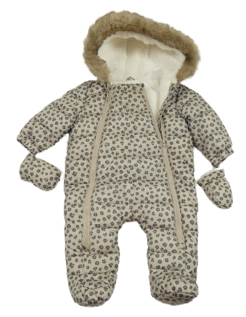 • Béžovo-šedá šusťáková zimní kombinéza s leopardím vzorem a kapucí s kožešinou + rukavice F&F