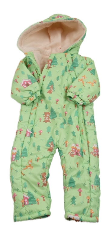 • Zelená šusťáková zimní kombinéza se zvířátky a muchomůrkami a stromečky a kapucí babyhug