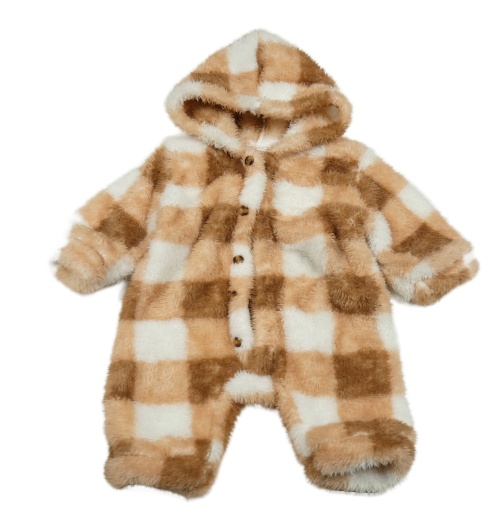 Oranžovo-hnědo-bílá kostkovaná chlupatá kombinéza s kapucí