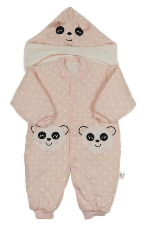Světlerůžová tepláková zateplená kombinéza s pandami a odepínací kapucí