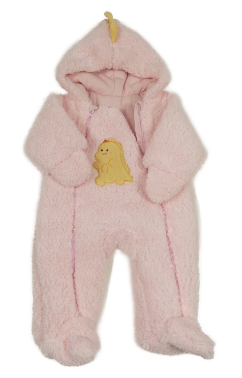 Světlerůžová huňatá zateplená kombinéza s dinosaurem a kapucí