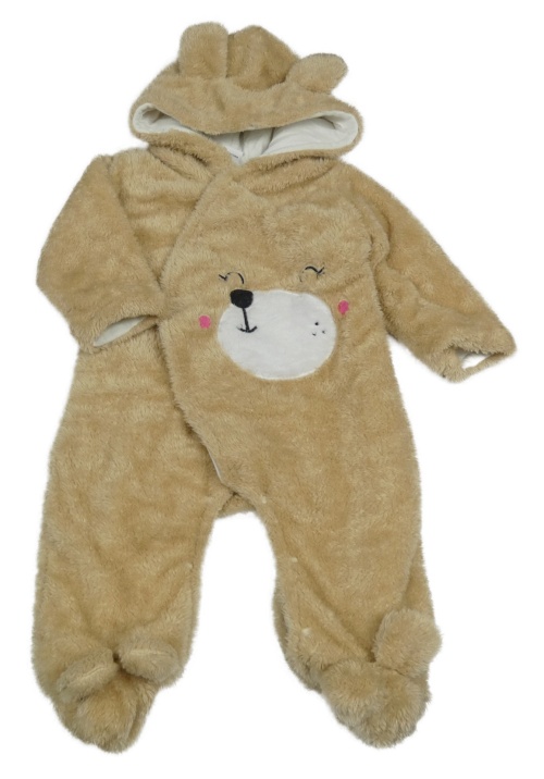 Béžová kožešinová podšitá kombinéza s medvědem a kapucí