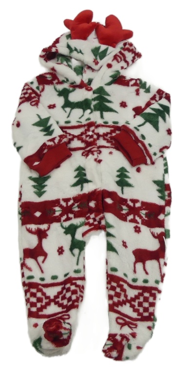 Bílo-červeno-zelená plyšová kombinéza se stromky a kapucí