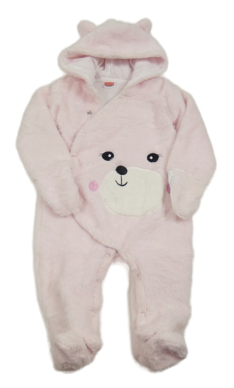 Světlerůžová chlupatá kombinéza s medvídkem a kapucí