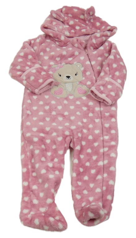 Růžová chlupatá kombinéza s medvědem, srdíčky a kapucí