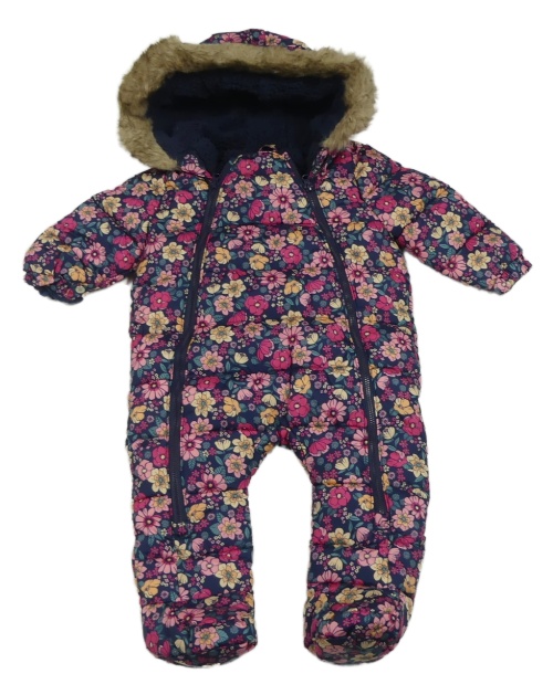 Tmavomodrá prošívaná šusťáková zimní kombinéza s kytičkami a kapucí s kožešinou F&F