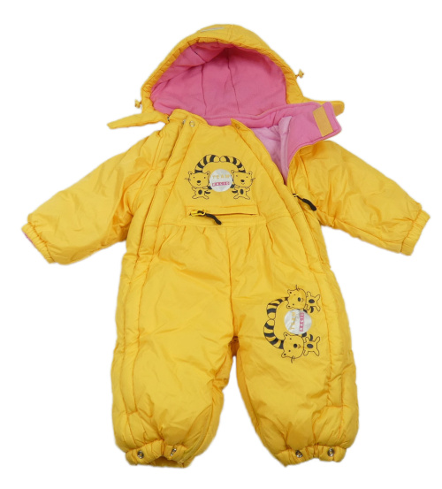 Žlutá šusťáková zimní kombinéza s kočkami a kapucí