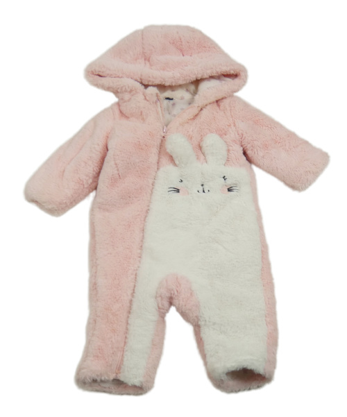 Růžovo-bílá chlupatá zateplená kombinéza s králíkem a kapucí