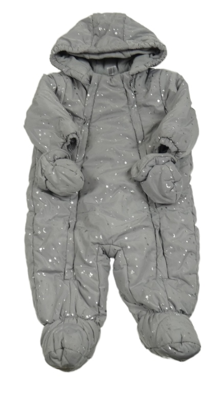 Šedá šusťáková zimní kombinéza s hvězdami a kapucí + rukavice C&A