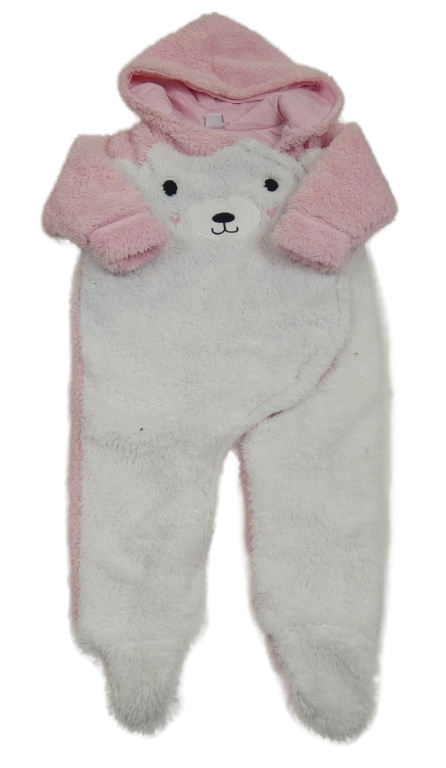 Bílo-světlerůžová huňatá podšitá kombinéza s medvídkem a kapucí dopodopo
