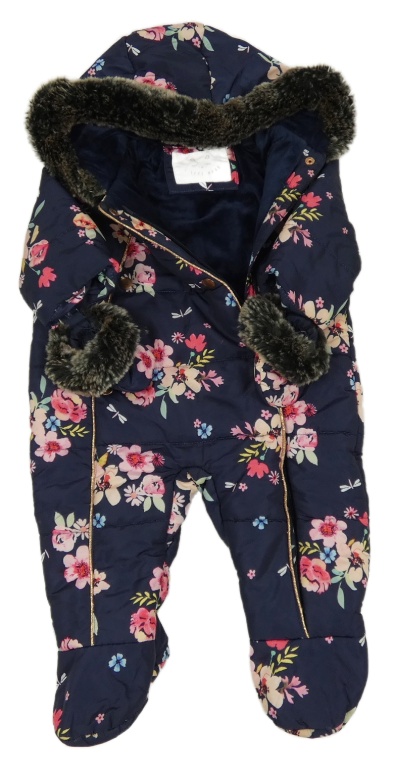 • Tmavomodrá šusťáková zimní kombinéza s květy a kapucí a rukavicemi Mothercare