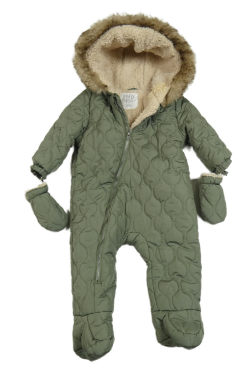 • Khaki šusťáková prošívaná zimní kombinéza s kapucí+ rukavice F&F