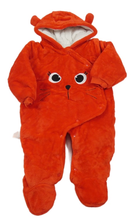 Červená chlupatá zateplená kombinéza s čumákem a kapucí
