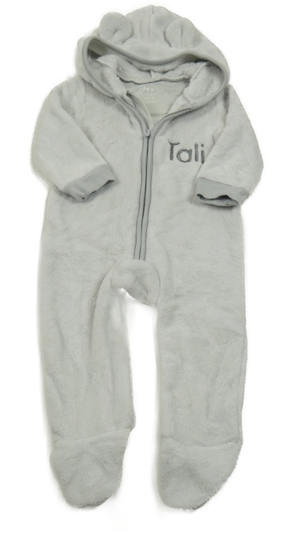 • Světlešedá plyšová kombinéza s nápisem a kapucí