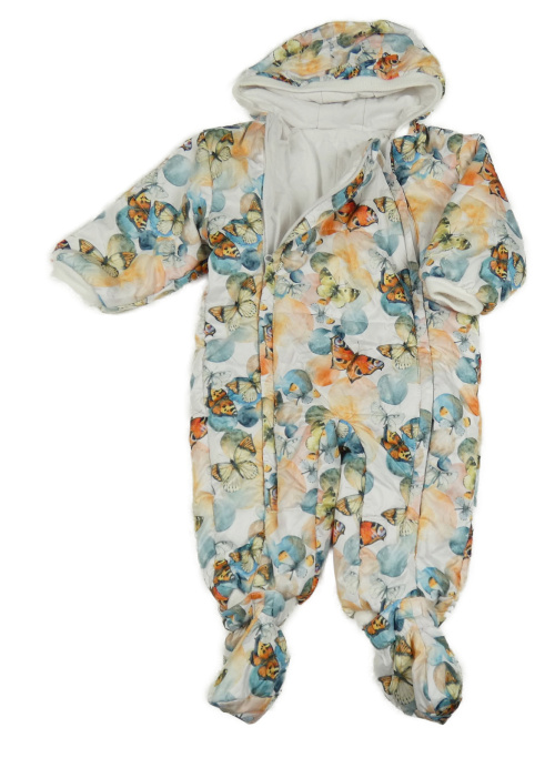 Bílo-oranžovo-zelená vzorovaná šusťáková zimní kombinéza s motýlky a kapucí +capáčky