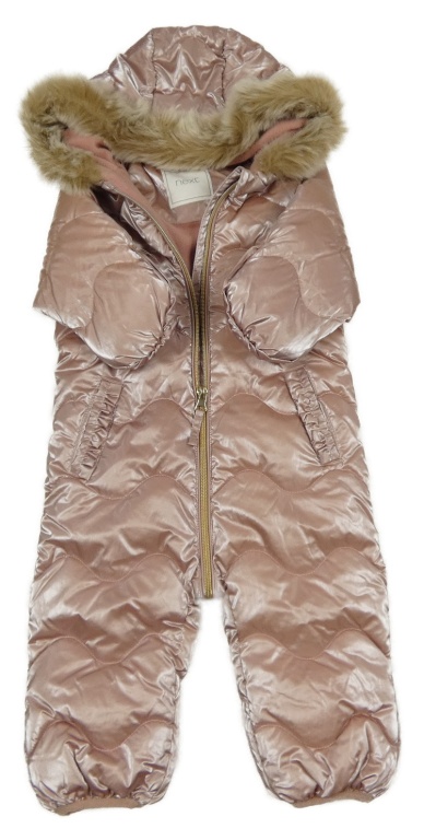 • Růžová šusťáková lesklá prošívaná zimní kombinéza s kapucí s kožešinou Next