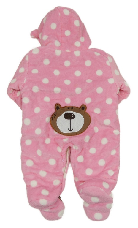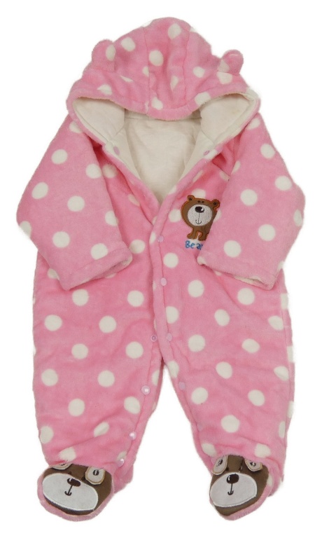 Růžová puntíkatá zateplená kombinéza s medvědem a kapucí