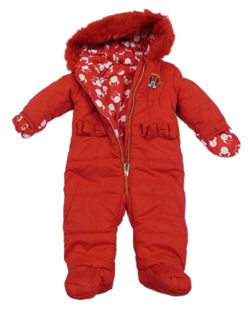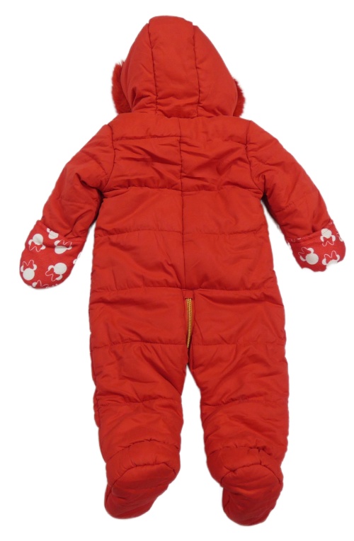 • Červená prošívaná šusťáková zimní kombinéza s Minnie a mašlemi a kapucí s kožešinou George