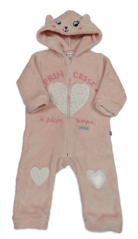 • Světlerůžová plyšová kombinéza se srdíčky a nápisy a kapucí s čumáčkem Sucre d'Orge