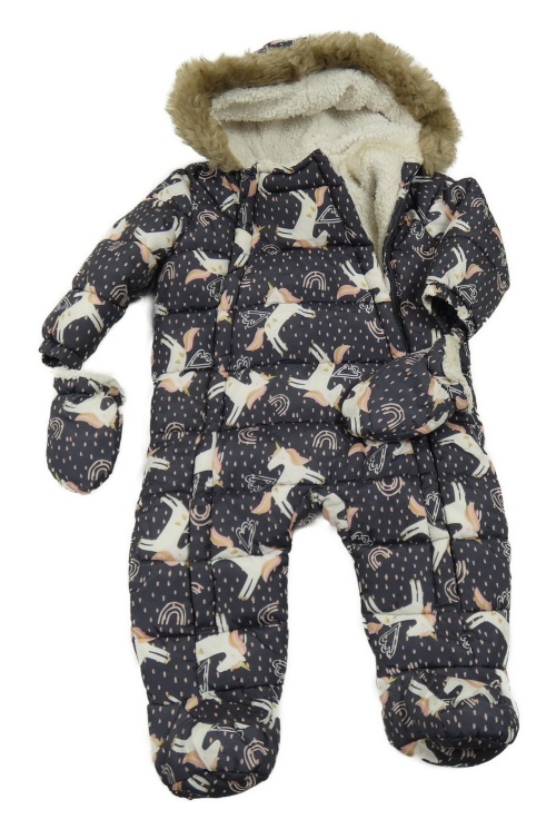 • Tmavošedá prošívaná šusťáková zimní kombinéza s jednorožci a kapucí s kožešinou + rukavice F&F
