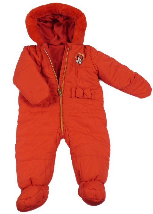 • Červená prošívaná šusťáková zimní kombinéza s Minnie a mašlemi a kapucí s kožešinou George