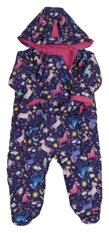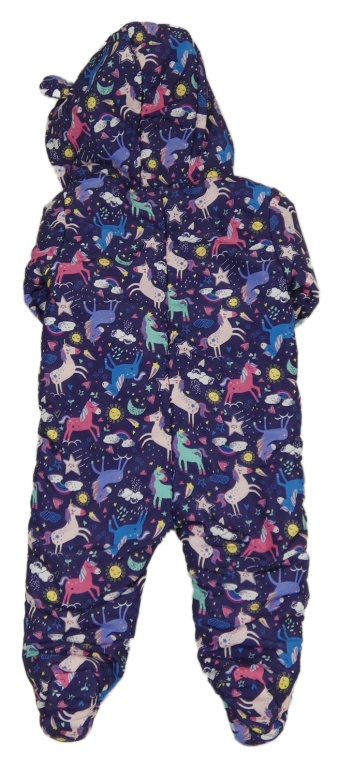 Tmavofialová šusťáková zimní kombinéza s jednorožci a kapucí + rukavice