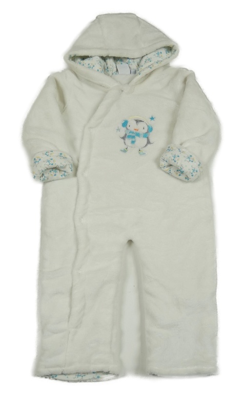 Smetanová plyšová zateplená kombinéza s tučňákem a kapucí