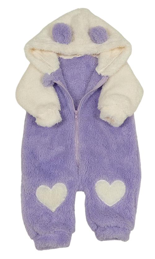 Lila-smetanová chlupatá kombinéza se srdíčky a kapucí s oušky
