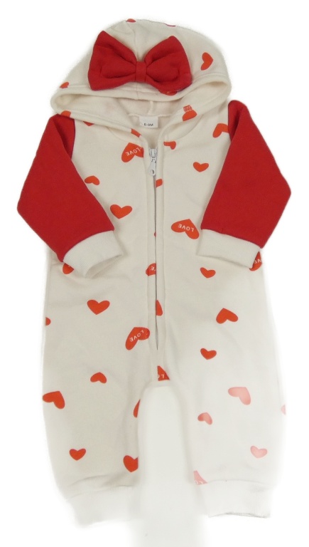 Smetanovo-červená tepláková kombinéza se srdíčky a kapucí s mašlí