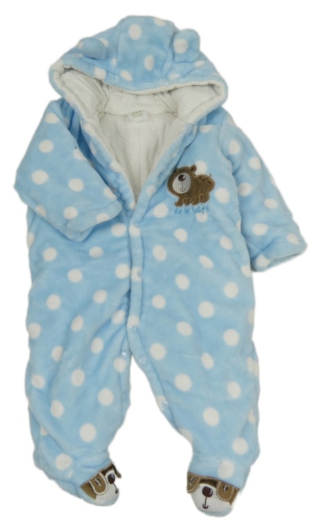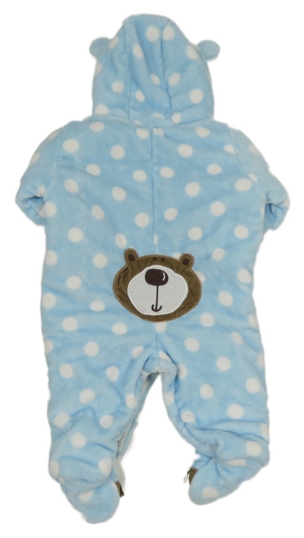 • Světlemodro-bílá puntíkatá plyšová zateplená kombinéza s medvídkem a kapucí s oušky