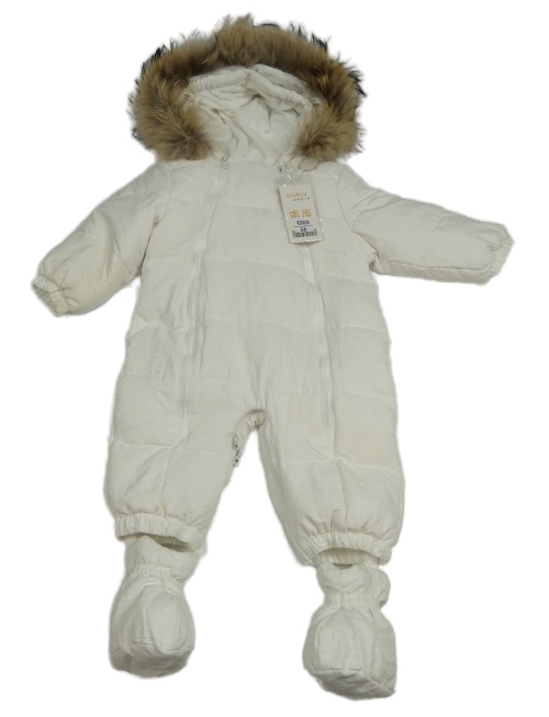 • Nová - bílá prošívaná šusťáková zimní kombinéza s kapucí s kožešinou + capáčky