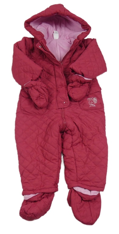 • Malinová šusťáková prošívaná zateplená kombinéza s kapucí + rukavice + capáčky C&A