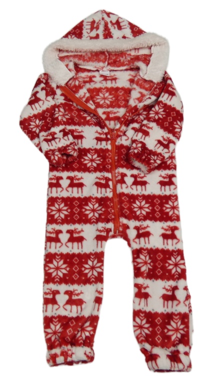 • Červeno-bílá plyšová kombinéza se soby a norským vzorem a kapucí s kožešinou