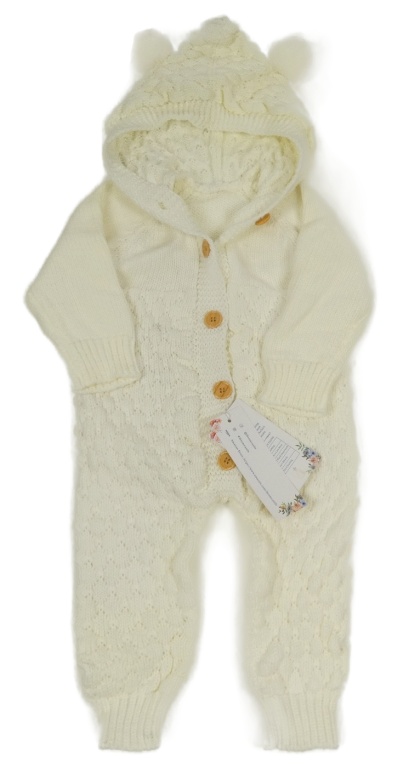 Nové - Smetanová pletená kombinéza s kapucí s bambulemi