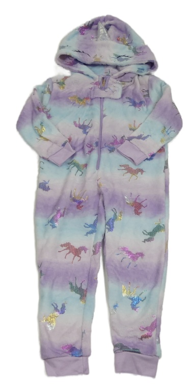 Lila-modrá pruhovaná chlupatá kombinéza s jednorožci a kapucí