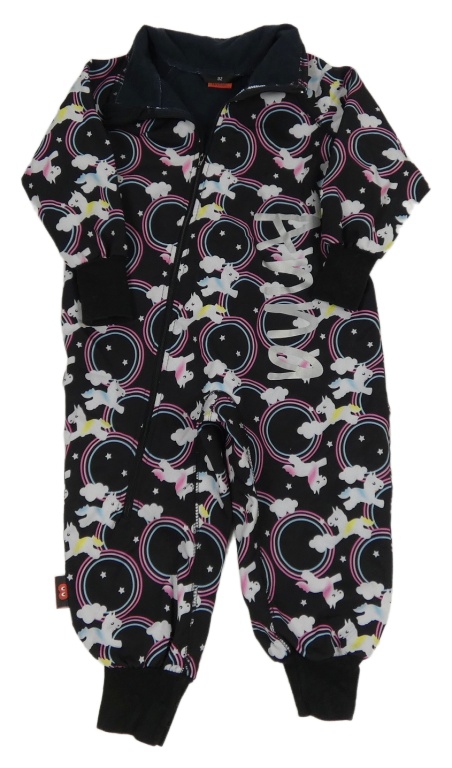 Černá softshellová kombinéza s jednorožci a duhami a nápisem