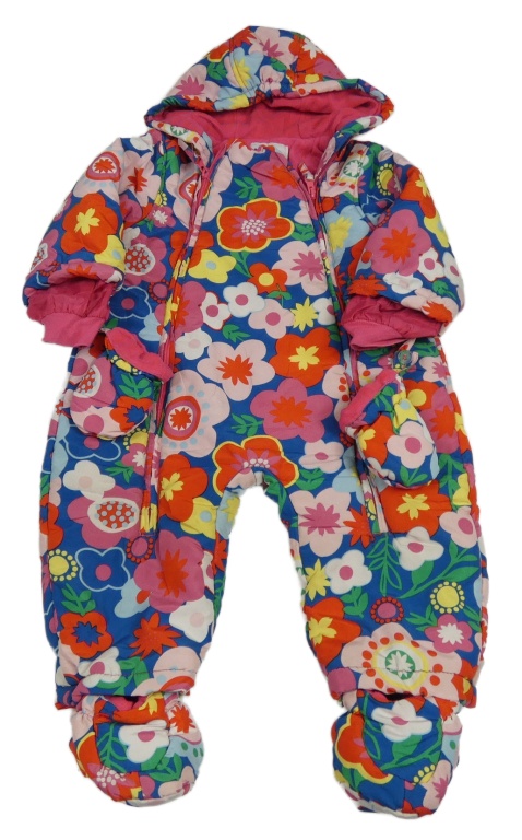 • Tmavomodro-růžovo-zelená květovaná šusťáková zimní kombinéza s kapucí + rukavice + boty