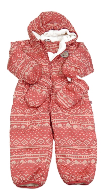 • Růžovo-bílá vzorovaná šusťáková zimní kombinéza s nášivkou a kapucí + rukavice Impidimpi