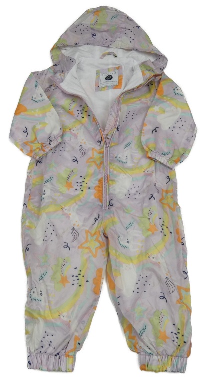 Lila šusťáková jarní kombinéza s jednorožci a kapucí Tu