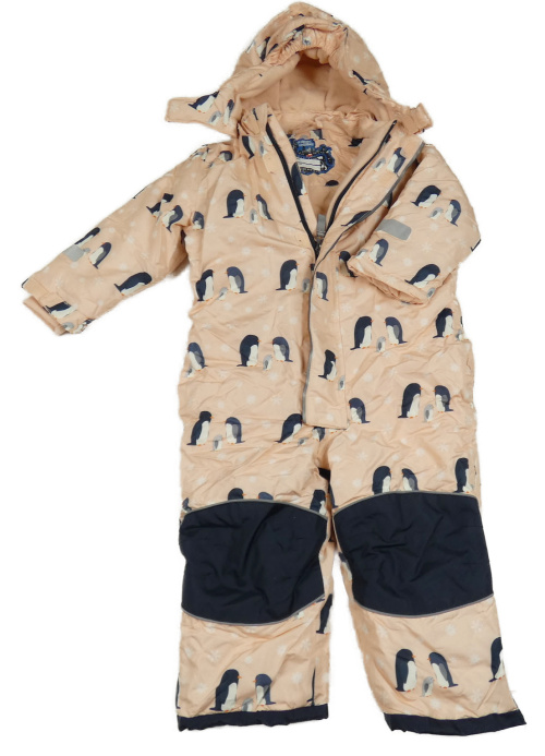 • Meruňkovo-tmavomodrá šusťáková zimní kombinéza s tučňáčky a odepínací kapucí TCM