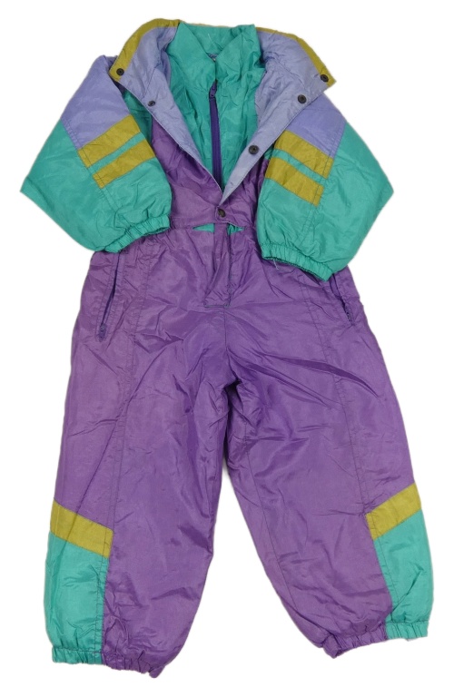 Fialovo-tyrkysová šusťáková zateplená kombinéza s ukrývací kapucí