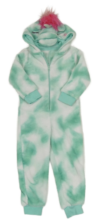 Zeleno-bílá vzorovaná plyšová kombinéza s kapucí - jednorožec