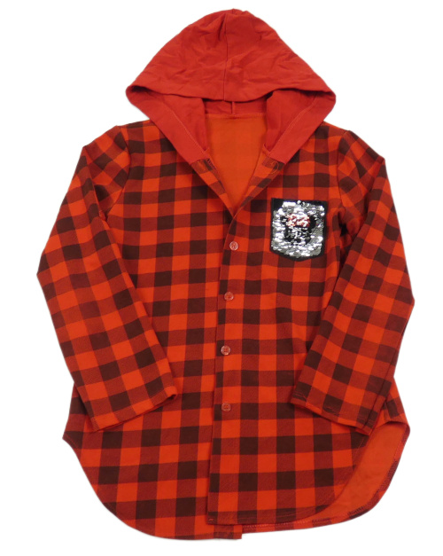Červeno-černá kostkovaná halenka s flitry a kapucí