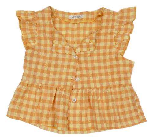 Oranžovo-růžovo-žlutá kostkovaná krepová crop halenka s volánky SHEIN