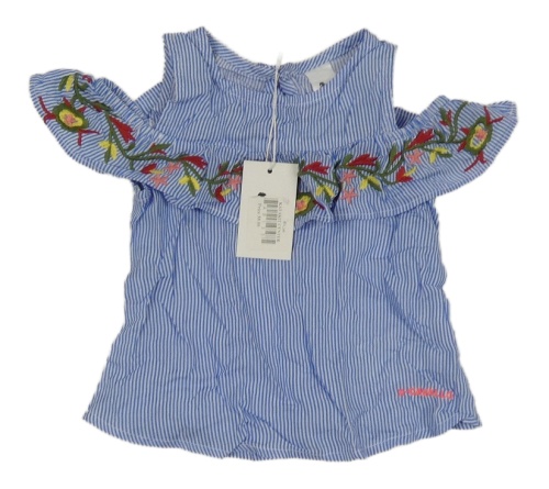 Nové - modro-bílá pruhovaná halenka s volánkem s kytičkami a volnými rameny X-CAVALLO