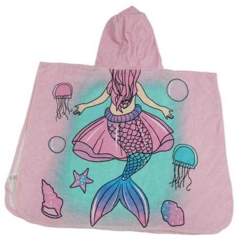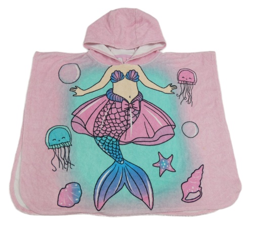 Světlerůžovo-tyrkysové froté osuškové pončo s mořskou pannou a kapucí