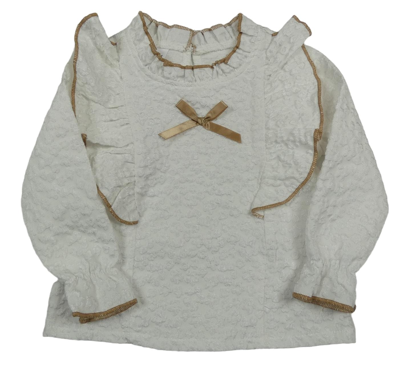 Bílá mačkaná halenka s volánkem a hnědou mašličkou