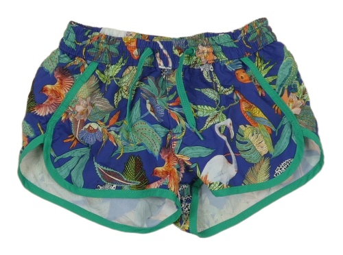 Tmavomodro-zelené plážové kraťasy s papoušky