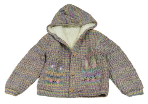 • Fialovo-zeleno-okrový pruhovaný propínací zateplený svetr se zajícem a kapucí Nutmeg