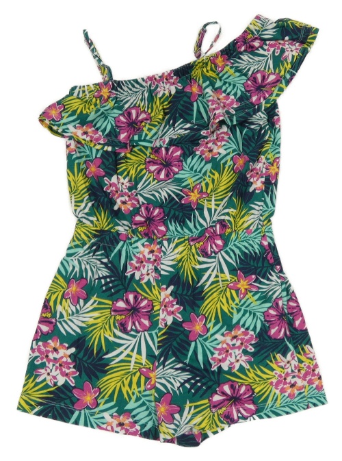 Tmavozeleno-barevný květovaný kraťasový overal s volánkem